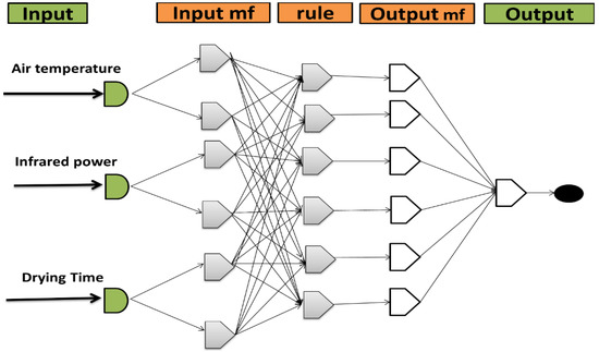 The ANFIS model is a soft computation model that serves as a combination of neural networks and fuzzy systems [20]. Hence, it provides a synergetic effect that incorporates the advantages of both systems in linear and non-linear processes. ANFIS constitutes an integration of fuzzy inference systems (FIS) and ANNs, maintaining both advantageous features in a single structure, such as the trainability, the optimizable connectionist structure, the human expert knowledge in linguistic terms using if-then rules. In ANFIS, the main problem is determining the type of membership function and their degree of membership, for which there is no specific solution, and by using trial and error, the best structure of the model is determined. For this purpose, in training the structure of ANFIS, the hybrid method was used, which is a combination of the least-squares method and the back propagation method. ANFIS can be potently employed to find the optimum relationship between a set of input and output data effectively. Fuzzy rules can be generated from the given input-output data by implementing the Takagi–Sugeno fuzzy inference system, thus this system is always interpretable in terms of fuzzy if-then rules in contrast with ANNs where the knowledge gained by training is split in every network weight and is not possible to be interpreted by humans [20]. The inputs and outputs parameters are related together using some fuzzy rules known as IF-THEN rules. In the present study, fuzzy IF-THEN rules were used to evaluate the MR of parboiled hulls. ANFIS is a five-layered model that utilizes fuzzy logic controllers in solving problems at a high rate with a minimum steady-state error. The ANFIS model consists of five layers whose functions are fuzzification, multiplication, normalization, defuzzification, and summation, respectively [42,47]. The designed ANFIS system consists of three inputs (inlet air temperature (T), infrared power (P), and drying time (DT)), and from the other side one outlet (MR (f)) (Figure 5). Fuzzy if-then rules are written for this structure based on Equations (7) and (8).
