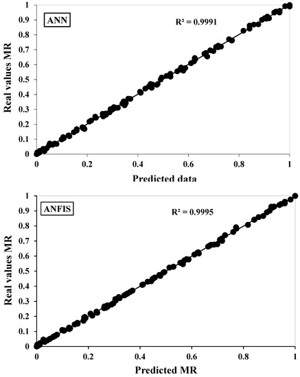The present study attempted to investigate the potentials of ANN, ANFIS, and SVR modeling techniques to estimate the MR of parboiled hulls. In order to have a measurement of the efficiency of the developed equations, three statistical functions were used (i.e., MSE, MAE, and R2). Table 6 shows the values of ANN, ANFIS, and SVR models. Accordingly, the ANFIS model provided higher accuracy than ANN. Furthermore, the predicted results against the actual values for the Gaussian membership function and the ANN are presented in Figure 9. Kaveh et al. [22] and Taghinezhad et al. [23] in a comparative application of ANN and ANFIS to predict the MR of onion and blackberry, respectively, reported that the ANFIS model performs better in predicting the MR. Amini et al. [29] and Satorabi et al. [27] also used ANN- genetic algorithm and ANFIS—to predict the MR of basil seed and apricot crops. They showed that the ANFIS model performed better due to the higher R2 value. Similarly, Zadhossein et al., [60] reported that the ANFIS model was slightly better than multilayer feed-forward neural networks models for the prediction of MR, energy, and exergy of Cantaloupe Slice in a microwave dryer. Bakhshipour et al. [28] reported that the ANN model was more accurate than the ANFIS and mathematical model for the prediction of stevia leaves in an infrared-assisted continuous hybrid solar dryer. However, Abbaspour-Giandeh et al. [61] and Chasiotis et al. [20] for drying quince and Echium amoenum Fisch. & C. A. Mey., respectively, were shown that compared to ANN and mathematical models, ANFIS is reported as the most suitable model for MR prediction