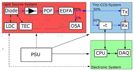 In this section, we explain the system configuration which was used for the indirect optical terahertz pulse shaping. The experimental setup is depicted in Figure 1. The system is split into four parts: light source system, terahertz system, electronic system for data acquisition, and the power supply unit (PSU). This section will focus on the light source system part, which is highlighted in red. It contains all the system components for manipulating and shaping of the terahertz spectrum. The terahertz and electronic system are like a conventional THz-CCS system. The light source is a commercially available SLD (SLD1550P-A40, Thorlabs, Maisons-Laffitte, France) which was also used by Molter et al. []. The injection current for the experiments was Idiode = 600 mA. The typical optical output power at a current of 600 mA is 50 mW. For the optical shaping, a programmable optical filter (POF, Finisar Wave Shaper 1000A) and for amplification an erbium-doped fiber amplifier (EDFA, EDFA100P, Thorlabs, Maisons-Laffitte, France) were used. The POF has an operating wavelength range from 1526 nm to 1568.7 nm and it can attenuate frequency components by up to 35 dB with a step size of 0.01 dB. The EDFA has a maximum output power of 23 dBm and an operating wavelength range from 1530 nm to 1565 nm. In front of the terahertz system part, the resulting optical spectrum is analyzed by splitting the optical power in 99% and 1% and sending 1% to an optical spectrum analyzer (OSA MS9740A, Anritsu, Kanagawa, Japan). After that, the signal gets split by a 50:50 beam splitter to the emitter on the one side and to the receiver on the other side. The receiver signal gets delayed in the free space part of a fiber-coupled mechanical delay line (OZ ODL-650-ML), which has a travel range of 50 mm (=330 ps), in a continuous scanning mode. The emitter is a InGaAs p-i-n photodiode, and the receiver is a photomixer for continuous wave excitation []. Both antennas are designed for an excitation wavelength of 1550 nm. In the terahertz path, four TPX-lenses (TPX35, Menlo, Mountain View, CA, USA) are used to guide the terahertz radiation from the emitter to the receiver. For alignment of the path, a terahertz frequency-domain (THz-FDS) system (Terascan 1550, Toptica, Munich, Germany) was used. This enables a qualitative comparison of system performance in different operating modes. The data acquisition (DAQ) used for the experiments is based on a Zürich Instruments MLFI 5 MHz lock-in amplifier. The integration time was set to 1 µs and the bias for the emitter to 1.4 V peak-to-peak amplitude with −0.2 V offset at a modulation frequency of 11.25 kHz which are the recommended settings from the manufacturer.