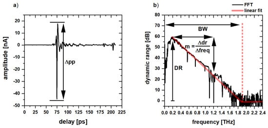 In Figure 2c, a continuous bandpass filter with the size ΔBP = 2 THz was applied to the SLD. The performance for each filter was determined by measuring dynamic range (DR) and peak-to-peak amplitude (Δpp). From this data, a value for the qualitative comparison of detected terahertz power (PTHz) and bandwidth (BW) was derived. In Figure 2a, the recorded terahertz time-domain trace is presented and the parameter Δpp is indicated. The continuous spectrum of the SLD leads to a single terahertz pulse. Figure 2b shows the corresponding terahertz spectrum. Indicated in the picture are the parameters for the peak DR specified at ~200 GHz and the range which was used for linearly fitting the slope m of the spectrum. To show the influence on the BW, the slope m was considered for the range between 0.2 THz and 1.2 THz as a parameter for the roll-off. This measurement shows that an increased DR increases the bandwidth of the system when the slope m stays constant. In red, the linear fit for this measurement can be seen in Figure 2b. The BW was determined by this fit as the intersection between the noise floor and the continued linear fit. The noise floor was calculated as the arithmetic average of the frequency-domain signal for frequencies between 2.2–4.0 THz. The result of this method is an approximated bandwidth which makes the bandwidth parameter quantitatively comparable for the following experiments.