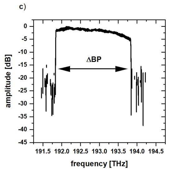 First, measurements with a continuous bandpass filter were done to find out the optimal size ΔBP and position as a reference for the comb structured filters. There is a slight positive trend for longer excitation wavelength visible (cf. Figure A1), which can be explained by a better conversion efficiency of the low energy photons []. However, since the SLD has the maximum in amplified spontaneous emission around 193 THz, the region around 193 THz was chosen for further experiments. Measurements with different continuous bandpass sizes from 0.2 THz up to 5 THz showed a saturation effect of the generated terahertz bandwidth around 2 THz for a bandpass size larger or equal to 2 THz (cf. Figure A2). This was also observed by Molter et al. []. To investigate whether an optical bandwidth above 2 THz provides benefits away from the terahertz bandwidth, we consider terahertz power in addition to the previously mentioned indicators.