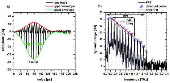 A typical terahertz time-domain trace is depicted in Figure 3a. As expected for a THz-QTDS trace, it consists of equally spaced pulses with a maximum peak-to-peak amplitude at the zero-delay position of the cross-correlation measurement. From here, the peak-to-peak amplitude decreases due to the incoherent nature of the used light source. To quantify the amplitude variation, we calculate the envelope of the signal (red and green) and use the FWHM of the lower envelope as a parameter for the coherence. Figure 3b depicts the terahertz spectrum which was retrieved by a Blackman window in the time-domain and FFT. The slope parameter was calculated from a linear fit through the detected peaks of the spectrum in the range between 0.2 THz and 1.2 THz.