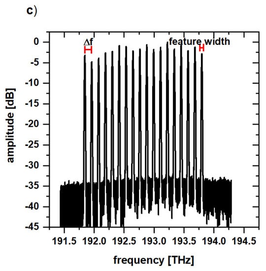 In Figure 3c, one of the investigated optical comb structures, created with the POF, is depicted. The previously shown 2 THz continuous bandpass filter was shaped into periodic features with a filter period Δf. The filter period describes the distance between the middle of two adjacent features. For the experiment, 20 different filter periods were created with 3 different feature widths, 5, 10 and 20 GHz, and Δf was varied from 30 GHz to 125 GHz in 5 GHz steps (cf. Table 1). Here, the feature width describes the width of the passband of the POF which might deviate from the actual FWHM. Due to the limited resolution of our OSA, we were not able to measure the exact FWHM of the optical features.