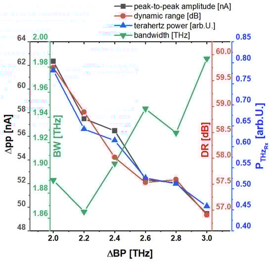 Different continuous bandpass widths from 2.0 to 3.0 THz in 0.2 THz steps and PRx = 20 mW optical power. The three parameters DR, Δpp and PTHz are linearly decreasing with increasing filter width. The bandwidth parameter BW is marginally increasing for larger bandpass sizes.