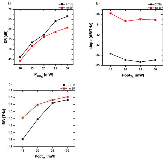 As a next step, we analyzed the behavior of a 2 THz bandpass filter for varying optical power at the antennas. The behavior between dynamic range, slope m and bandwidth for different optical powers is shown in Figure 5. In Figure 5a, the dynamic range over the incident optical power is depicted. The DR slowly saturates for increasing optical power. This can be attributed to a saturation of free carriers inside the active material of the antennas.