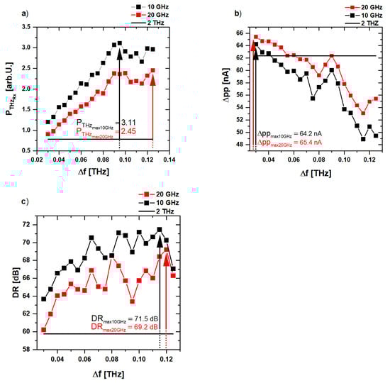 In this section, the results from the comb-like shapes as shown in Figure 3 are presented and analyzed. The shapes were created out of the 2 THz continuous bandpass [(cf. Figure 2c)] by periodically shaping 5 GHz, 10 GHz, and 20 GHz broad features in the continuous bandpass. This was done by blocking the output for the considered frequency span of 30 GHz to 125 GHz between the features, producing a periodic comb-like spectrum [(cf. Figure 3c)]. Figure 6a–c depicts the results for PTHz, Δpp and DR, respectively, for different filter periods Δf for 10 GHz and 20 GHz broad features at 20 mW incident optical power per antenna. For comparison with the continuous spectrum, the respective result for the 2 THz bandpass is indicated as a black line. The best value for each feature width and filter period is indicated by an arrow and the value is written in the figure.