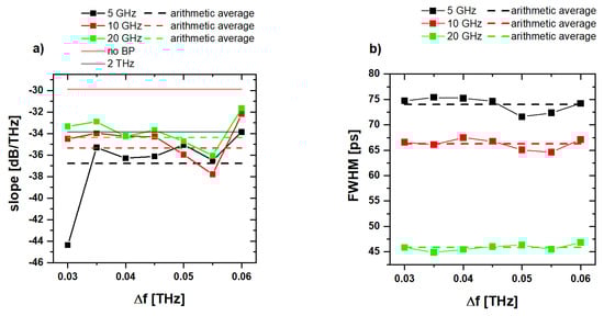 Analyzing the slope m and FWHM of the comb-like structures at three different feature widths (5 GHz, 10 GHz, and 20 GHz) at 15 mW optical power helps to point out the relationship between the spectral shape and the bandwidth. The measurements were done at 15 mW power per antenna because the EDFA was not able to amplify all optical spectra with 5 GHz feature width to 20 mW per antenna. Figure 7a shows the calculated slope m of the terahertz spectra, as indicated in Figure 2c and Figure 3c for different filter periods. A constant behavior for all three features widths can be seen. However, if the mean value of all slopes is considered, the continuous bandpass filtered case shows better results, while the unfiltered spectrum shows the best values for m. This behavior can be explained as follows. Since m corresponds to the bandwidth of the terahertz signal independently of the dynamic range, a high optical bandwidth favors a small slope. However, this positive effect of the unfiltered spectrum is cancelled out by the increased noise, as described above.