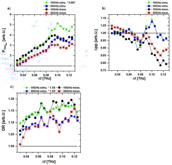 STHz() is the complex terahertz spectrum. HSys() is the complex transfer function (system dependent). |SII()|stands for the magnitude of the Fourier transform of the intensity autocorrelation function RII(). The transfer function was measured with a commercially available continuous-wave terahertz frequency-domain spectroscopy system (Toptica TeraScan 1550). The simulated photocurrent in the time-domain is calculated by inverse Fourier transform of . To compare the measurement with the simulation, the same time range relative to the maximum of the simulated photocurrent as in the measurement is considered. Moreover, the same signal processing and analysis steps are applied to the simulated data as to the measurement data. The comparison of the measurement and simulation can be seen in Figure 8 for the parameters PTHz, Δpp, and DR, respectively. To effectively compare the effects of the structuring of the optical spectrum, the data for PTHz, Δpp, and DR are normalized to the measurements for the 2 THz reference bandpass structure. The solid black line in Figure 8 represents the value for the 2 THz reference measurements. The simulation shows a good agreement with the measurement results. For the feature periods in the range from 0.03–0.9 THz, the simulation results match the experiment nearly perfectly for PTHz with a feature width of 20 GHz, while it shows a ~33% difference in the 10 GHz feature width case. The graph for Δpp shows again a strong deviation for filter periods bigger than 0.8 THz. However, the rest of the data match the measurement results quite well. In Figure 8c, the DR is plotted and the deviation between measurement and simulation is similar for both feature widths and lies around 5% lower than the measurement data. These results correspond to the fact that there are effects in a THz-CCS system which are not included in our model. However, we can predict the DR of a THz-CCS system with this numerical approach with a 5% accuracy.
