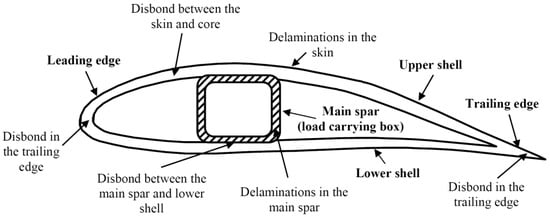 The main requirement for WTBs is the long fatigue life. Therefore, the structure has to sustain 108–109 load cycles before failure if the turbine is designed for 25 years of operation []. Taking that into account, the polymer composites, which are made of strong, stiff, lightweight, corrosion-resistant, dielectric materials, are the most practical and prevalent choice for the manufacture of the WTBs []. However, due to the ever-increasing WT dimensions of blades, the gravity and inertia loads keep dominating against aerodynamic loads. The gravity loads being reversible per each rotation cycle are significant sources of WTBs fatigue damage, while the aerodynamic loads are responsible for the generated energy. Therefore, to reduce the weight of the WTBs, the complex design from fibre composites with sandwich structures joined by adhesive bonding is used. Usually, WTBs are made from glass fibres/epoxy composites and polymer foams or balsa wood sandwich structures [,,]. Natural composites and hybrid composites adding carbon, aramid, or basalt fibres are also possible []. Another important aspect worth paying attention to when choosing materials for blades is sustainability which affects the new trend to use more easily recyclable thermoplastic resins [,]. Production defects, transportation and installation damages, and irregular loading, including cyclic stresses, moisture and temperature variations, lighting strikes, and bird impact, cause complex processes of damage formation and an increasing number of damages and a variety of failure mechanisms [,]. Different degrees of blade failures take about 5% of total wind turbine faults []. Debel [] identified different types of damage of WTBs: skin/adhesive debonding, adhesive joint failure between skins, sandwich debonding, delamination driven by buckling, splitting along fibres, gelcoat cracking, and gelcoat/skin debonding. The damages of composite materials can be classified as surface erosion, nonstructural damages, and delamination; structural damages as adhesive layers debonding and fibre failure []. The common damage modes in WTBs are shown in Figure 2.