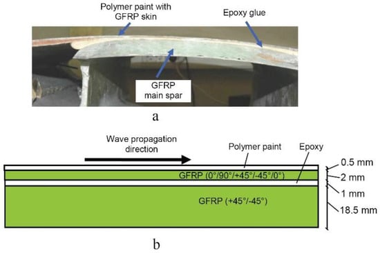 The whole WTB is made of a composite structure, which consists of several material layers with different geometry and material properties. Generally, the WTB consists of the surface layer, epoxy, and unidirectional GFRP. Each main layer is of a different thickness Figure 4b. Other features: the WTB skin and main spar consist of several GFRP plies, with orientations of 0°/90°/+45°/−45°/0° and +45°/−45°, respectively. Thus, the second parameter that is especially important and is used in the study of WTB is the elastic properties of the whole object. The elastic properties are used to describe the theoretical dispersion curves, which are used to obtain comparable results. The main parameters are density (ρ) and elastic constants as Young’s modulus (E) and Poisson’s ratio (υ). Generally, the manufacturers provide the elastic properties of the individual layers, as presented in Table 1 []. Then, using the analytical or semianalytical methods, the Lamb waves dispersion features of the whole object are obtained.