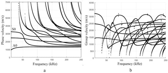 The calculated dispersion curves clearly show the dispersion phenomenon (the velocity is a function of frequency) and the existence of an infinite number of Lamb wave modes. At the lower frequency, two dispersive modes A0 and S0 are clearly visible and distinguishable, as seen in Figure 5a,b. However, other modes are difficult to identify.