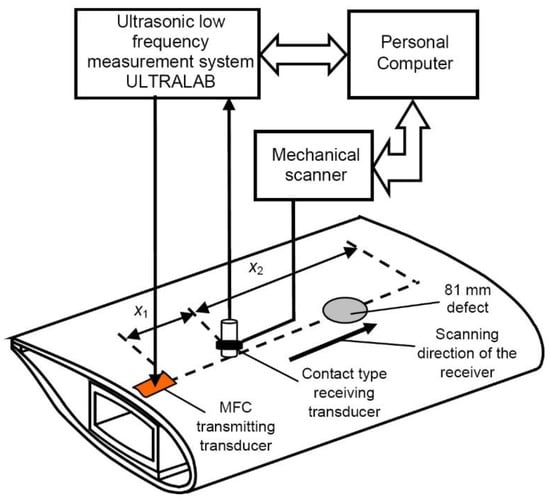 To show the signals of the Lamb waves and their waveform changes, the signals of Lamb waves propagating in the WTB obtained during an experiment are registered. The artificial defect having a diameter of 81 mm was made by drilling out the region of the main spar, simulating the real disbond type defect between the main spar and covering shell. The typical measurement systems used in the SHM and NDT are presented in Figure 3b,c respectively. The more accurate hybrid experimental measurement setup for the WTB testing using SHM and NDT techniques is presented in Figure 6. The low-frequency ultrasonic measurement system ‘Ultralab’ developed and manufactured at Ultrasound Institute, Kaunas University of Technology, consists of the high voltage generator, the low noise amplifier and an analogue to digital converter. The maximum output voltage of the generator is 750 V. Gain of the amplifier can be changed from 10 dB to 50 dB. The low noise 13 dB preamplifier is connected directly to the receiver in order to improve the signal-to-noise ratio. The ultrasonic transmitter was excited by a single rectangular pulse with a duration of 11.6 ms (it corresponds to half of the period of frequency 43 kHz), and the voltage of 120 V. Scanning was performed with 0.1 mm scanning step along x direction. The permanently fixed macrofibre composite (MFC) transmitting transducer was used as a transmitter in order to generate the A0 mode of 43 kHz. The contact type receiving transducer was scanned away from the transmitter from x1 = 30 mm up to x2 = 160 mm in order to obtain the B-scan image. The B-scan image and waveforms of the experimental signals (mainly the A0 mode) of Lamb waves (before the defect, in the region of the defect, and behind the defect) are presented in Figure 7.