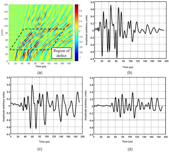 The B-scan image and waveforms of the experimental signals of Lamb waves (the A0 mode). Distance from transmitter (a) 40 mm (position in the B-scan before the defect: x = 10 mm), (b) 95 mm (position in the B-scan, in the region of the defect: x = 65 mm), (c) 170 mm (position in the B-scan, (d) behind the defect: x = 140 mm).