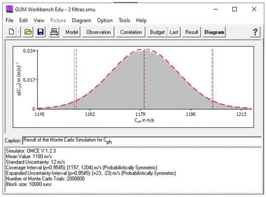 It is crucial to have software for estimating measurement uncertainty. The combined uncertainty can be processed and analysed using GUM Workbench software (Metrodata GmbH) or similar. GUM stands for Guide to the Expression of Uncertainty in Measurement. This software allows comparing the results obtained with the simulated data and evaluating whether a correct number of measurement points has been selected []. The results calculated by GUM are compared with the simulated results when using 2 million trials, as presented in the example of phase velocity estimation of a particular UGW (Figure 8). The difference between results from the two methods does not have a significant influence on the relative uncertainty.