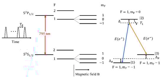 To simplify the analysis, a two-level system with is adopted, which can be easily found in atoms, such as in the transition of 87Rb, as shown in Figure 1. Under a static external magnetic field, a two-level system splits into a three-level system because of the Zeeman effect, which is the simplest structure for our study. Assuming that the probe field is weak enough not to affect the preparation of the atomic state, we then consider this three-level Λ system interacting with the fs pulse train. The pulse train is assumed to be linearly polarized, which can be decomposed into left-circularly and right-circularly polarized components coupled with the transitions from to and to , respectively. The Hamiltonian of this system is
