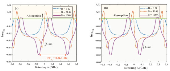 where . The spontaneous relaxation time of 87Rb is and [19]. The real part of the off-diagonal elements ( and ) represents dispersion, and the imaginary part represents absorption. Therefore, the gain of the atomic system is related to the imaginary part of the off-diagonal element.