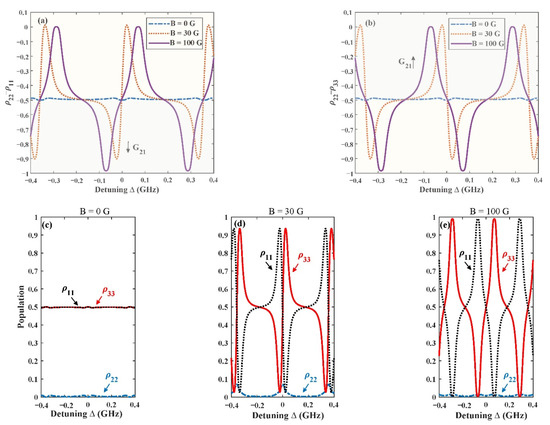Variation of the population inversion of (a) () and (b) () with detuning at different magnetic fields. Variation of the population () with detuning when (c–e) are B = 0 G, 30 G, 100 G, respectively. Other parameters are the same as those in Figure 2.