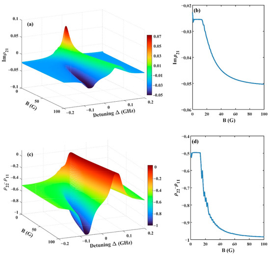 (a) Variation of the gain Im with detuning and (b) the projection of the maximum gain for different magnetic fields. (c) Variation of population inversion ( ) with detuning, and (d) the corresponding variation of population inversion at the maximum gain for different magnetic fields. Other parameters are the same as those in Figure 2.