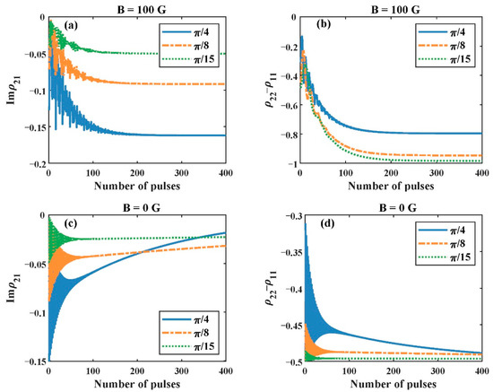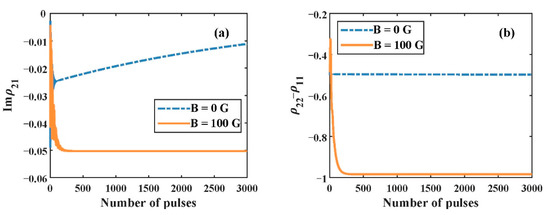 The number of pulses is also an important parameter. The influence of whether the magnetic field is added to the system on the gain variation with the pulse number is shown in Figure 5. When there is no magnetic field, the system’s gain gradually decreases as the pulse number increases. It should be noted that the system at a steady state has no gain, and all populations are equally distributed on ground state levels and . In this case, the system no longer absorbs and amplifies the probe field, which can be considered the EIT phenomenon. However, with the presence of a magnetic field, the gain of the three-level system increases rapidly as the pulses accumulate, and it reaches its maximum after several cycles, while the population of the system remains almost completely in its ground state .