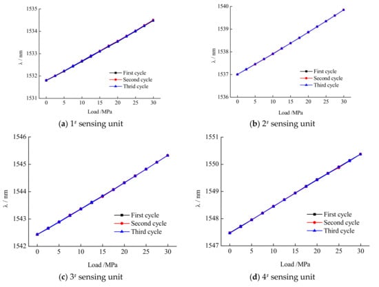 (1) Sensor preloading: Temperature will have an influence on the sensor. Based on previous experience in field stress testing, we decided to set 20 °C as the calibration temperature. Firstly, put the sensor in the laboratory for more than 2 hours at room temperature, 20 °C, to eliminate the effect of temperature change. Then, place the sensor in the calibration device for preloading. Each sensing unit preload is divided into three levels: 80, 160, and 240 kg, respectively, which correspond to the loading pressures 10, 20, and 30 MPa, respectively. For each preloading level, the loading stability time is set as 5 min. After loading, unload the sensing unit to a zero pressure state, and adjust the sensor position for the next preloading of the sensing unit. The purpose of preloading is to make close contact between the sensor parts to ensure that the sensing units will be of strong working condition and that the wavelength output will be more stable. At the same time, check whether the calibration device and related test instruments are working properly, and whether the test data output are accurate.