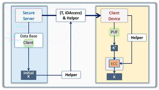 Block diagram of an ECC scheme. The challenges (T, IDAccess) generate the responses K from the image of the PUF stored by the server, and the response K’ from the PUF. The helper transmitted by the server allows the ECC fuzzy extractor of the client device to recover K from K’.