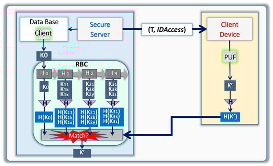 Block diagram of RBC search engine scheme. The challenges (T, IDAccess) generate the responses K0 from the image of the PUF, and the responses K’ from the PUF. The RBC finds K’ through an iterative process from K and H(K’).