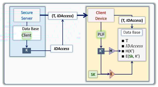 Block diagram of the encapsulation of the session key Sk. IDAccess is computed from the image of the PUF. The challenges (T, IDAccess) generate K’ from the PUF. The client devices store the challenges, the ciphertext of Sk encrypted with K’, and the message digest H(K’).