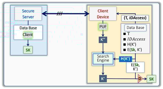 Block diagram of the recovery of the session key Sk by the client device. The challenges (T, IDAccess) generate K” from the PUF. The search engine finds K’ through an iterative process from K” and H(K’). The ciphertext is decrypted with K’ to recover Sk.