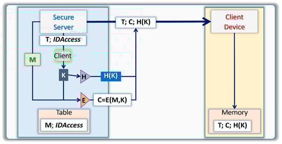 Block diagram of the encryption of file M for IoTs. The server prepares the challenges (T, IDAccess). The digital file M is encrypted with K by the IoT, which stores only T, ciphertext C, and message digest H(K). The server keeps IDAccess in a look-up table for future operations.