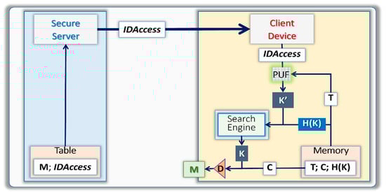 Block diagram of the decryption of M. The server transmits IDAccess to trigger the process. The challenges (T, IDAccess) generate K’ from the PUF. The search engine finds K through an iterative process from K’ and H(K). The ciphertext is decrypted with K to recover M.