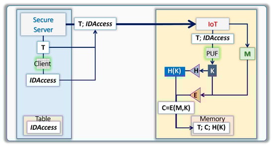 The method proposed in this section to protect digital files is a variation of that presented above. Here, the information generated at the IoT level and which is stored by the IoT for future use is protected. The objective is to prevent a third party from simply retrieving information from the memory unit of the IoT, which is equipped with its own one-way unclonable function. During the preparation cycle, as shown in Figure 7, the server generates the challenges (T, IDAccess) from the image of the PUF. The client device goes through the following steps: