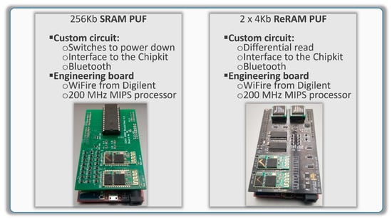 Future work: Unlike SRAM PUF based solutions, which are commercially available, and which have solid performances, the deployment of schemes using pre-formed ReRAMs requires additional research, that is not underestimated by the authors. We intend to perform exhaustive characterizations of BERs of the ReRAMs, with additional enrollment cycles, extended temperature cycles in the −40 °C to +140 °C range, increased buffer sizes of the number of pairs, and accelerated aging cycles. As the expected BERs will be in the 10−6 to 10−10 range, the experiments will need to run for months in order to produce statistically valid results. The cryptographic protocols and the software driving the schemes require further optimization to enhance security and mitigate various cyber-attacks. We are also aware of the need to involve independent third-party investigators to identify potential weaknesses in the proposed methods. The methods presented in this paper could be considered for the following applications: