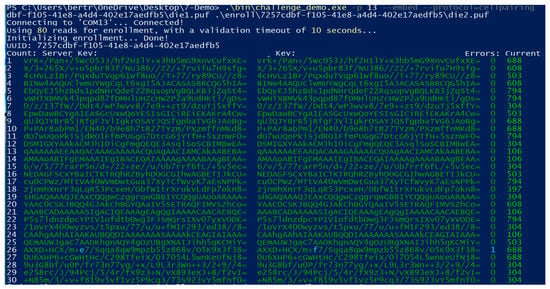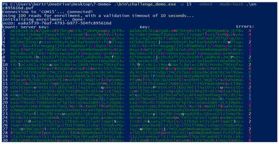 C = (T, IDAccess) of Section 2.1 is the stream of challenges, while K is the stream of responses. During key generation cycles, the responses of K should match the ones generated upfront during enrollment. The protocols based on PUFs are effective with error-correcting schemes that are able to handle moderate aging, and environmental effects [5,6,7,8]. Examples of implementation with various PUFs are summarized in Table 1.