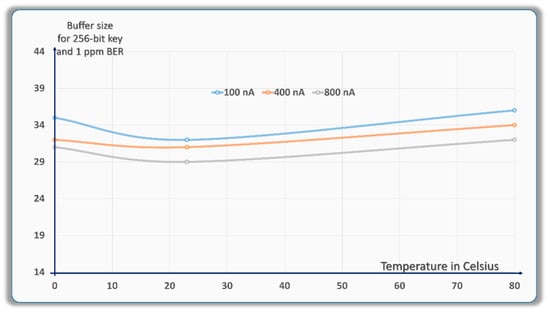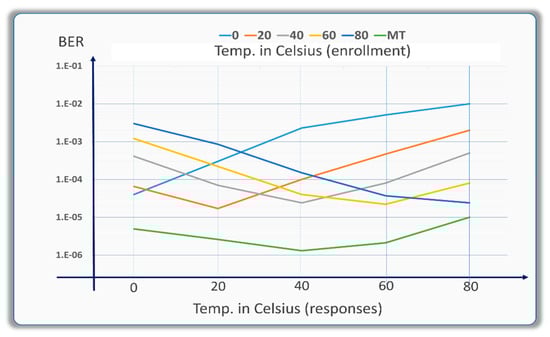 The addition of a third state allows the tracking of the portions of the PUF that should be masked because they are fuzzy, marginal, unstable, or fragile. The objective is then to reduce BERs and improve reliability [22,23]. A thorough enrollment cycle to identify these “weak” portions and their masking during response generation, results in a better quality PUF, requiring little to no error-correcting scheme for cryptographic key generation. The knowledge of the addresses with fragile physical elements that can be damaged during normal operations have tamper-resistance properties [15]. A cryptographic protocol generating keys solely from the addresses of PUFs that are known to be reliable does not damage the weak portions of the PUF. However, an opponent trying to interact with the PUF without such knowledge could partially damage the PUF, leaving behind traces of the attack. A protocol to sense attacks could include reading these addresses at a very low electric current, to detect abnormal BERs.