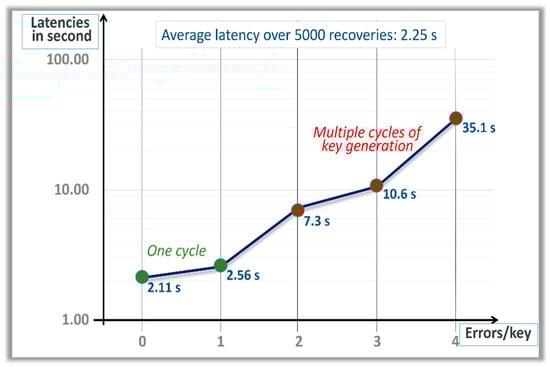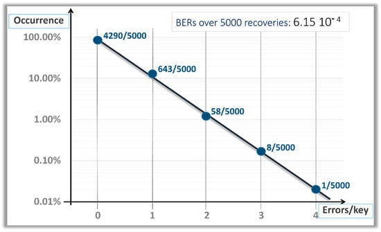 RBC enhances the protection of the key generation process by eliminating the need to operate a fuzzy extractor at the client device level, see Figure 2. In lieu of generating a data helper from K, the client device hashes K’ to generate the message digest H(K’), which is transmitted to the server. The RBC is a search engine that is able to recover K’ from K and the message digest H(K’) [30,31,32]. Through an iterative process, the RBC search engine hashes the initial response K = K0 and compares the message digest H(K0) and H(K’). If these two do not match, the RBC tests all data streams K1k from a Hamming distance of 1 of K0. If these do not match, the RBC iterates and tests all data streams K2k from a Hamming distance of 2. Such an iterative process can handle Hamming distances up to 3, and 256-bit long responses. Beyond this, the latencies become prohibitive. A scheme fragmenting the data streams with nonces has been documented as effective with BERs as high as 20%. For example, if 256-bit long responses are impacted by 7% BERs, a fragmentation of 4 is applied; with SHA-128, H(K’) as a 4 × 128-bit long stream. Each fragment is filled with nonces and is hashed. The RBC does not necessarily consume less power than a mainstream ECC, and it is not faster; however, the burden is moved to the server, thereby reducing both the vulnerability and the power consumption at the client device level. The hashing of K’ is a light operation. Hashing methods such as SHA-128 or SHA-256 are extremely fast, and commercial implementation in hardware embedded in cryptographic processors is available. The RBC can also benefit from high-performance computing (HPC), graphic processor units (GPU), and associative processor units (APU), all of which leverage the possibility of distributing the search through parallel computations [33,34]. This approach can also leverage noise injection schemes relying on HPC solutions, which reduce the risk of exposure to certain attacks. The opponents need access to similar computing power in order to participate. The use of HPC is not recommended for the “RBC-light” version needed for key recovery, see Section 3.3.