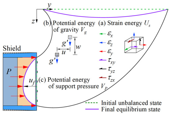 In our model, the moved soil is regarded as the studied system in our method. The potential energy of the studied system contains three components: elastic strain energy stored in the deformed system (Us), the potential energy of gravity (Vg), and the potential energy of the support pressure (Vp). Vg and Vp belong to the potential energy of external force associated with the external force (V).