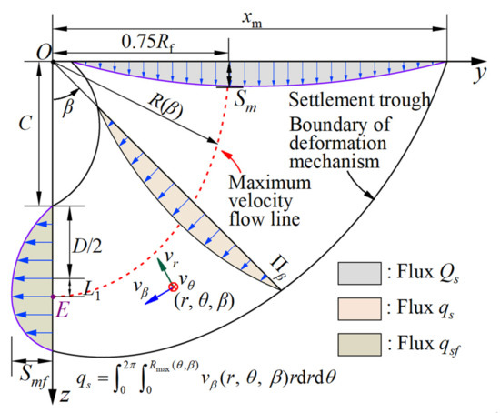 As shown in Figure 4, the maximum displacement on the tunnel face is Smf and is located at point E. The maximum velocity flow line is a quarter of an ellipse, with respect to the origin O. The semi-major axis of the ellipse is Rf = C + D/2 + L1. L1 is the distance between the center of the face and point E. The semi-minor axis of the ellipse is 0.75 Rf. For a better description of the deformation mechanism, the curvilinear coordinate system (r, θ, β) is adopted.