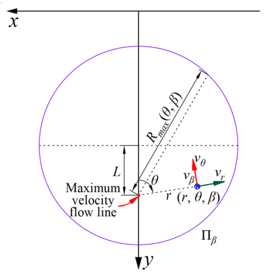 On the Πβ plane, the orthoradial displacement component (vr) is assumed to be zero. The axial displacement component (vβ) is assumed to decrease in a parabolic way to vanish at the boundary, as shown in Figure 4. Equation (11) gives the orthoradial displacement of points (r, θ, β) on the plane Πβ: