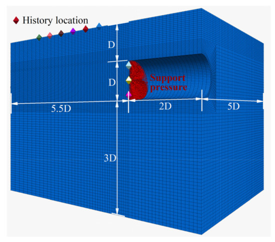 As shown in Figure 6, only a half model is built due to the symmetry along the tunnel central line. The tunnel diameter and cover depth are 12 m. To guarantee the accuracy of the numerical model, the dimension size should be large enough to wake the influence of the boundary, and the specific dimension is shown in Figure 6. The mechanical parameters of the soil and support pressure are shown in Table 1.