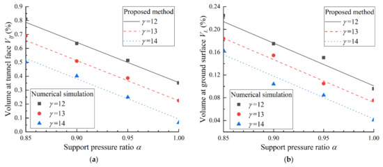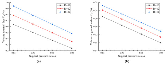 The influence of the support pressure ratio α on the volume loss with the tunnel diameter ranging from 10 m to 14 m is shown in Figure 8. The tunnel depth was 15 m and the slurry weight was 12 kN/m3. The volume loss decreased linearly with the increase in the support pressure ratio, which implied that the increase in the support pressure ratio was favorable to the control of volume loss, including the volume loss at the tunnel face and the volume loss at ground surface. Moreover, the deeper the tunnel, the bigger the volume loss. The volume loss at the tunnel face is generally bigger than the volume loss at ground surface, due to the soil compression during ground movement. The influence of the tunnel diameter on the volume loss at the ground surface is much smaller than that at the tunnel face.