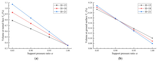 The influence of the support pressure ratio α on the volume loss with the tunnel depth ranging from 15 m to 21 m is shown in Figure 9. The tunnel diameter was 12 m, and the slurry weight was 12 kN/m3. With the increase in support pressure ratio, volume loss decreased linearly. Moreover, the deeper the tunnel, the faster the volume loss decreased. When α = 1, the tunnel depth did not influence the volume loss at the tunnel face. However, the tunnel depth will influence the soil compression, and the volume loss at the ground surface will be affected by the tunnel depth.