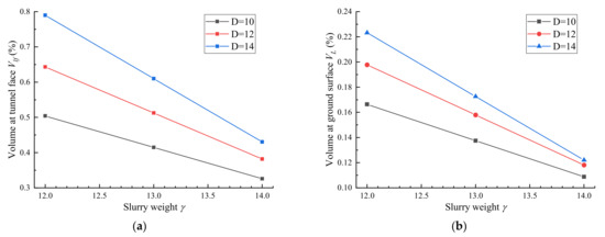Volume loss versus slurry weight γ with different tunnel diameter D. (a) Volume loss at tunnel face Vlf, (b) volume loss at ground surface Vlg.