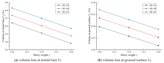 Volume loss versus slurry weight γ with different tunnel depth H. (a) Volume loss at tunnel face Vlf, (b) volume loss at ground surface Vlg.