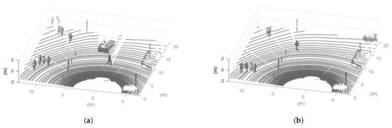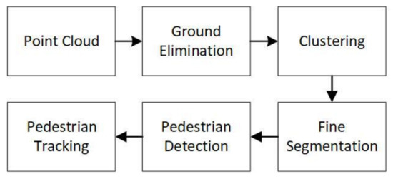 People are the most important part of our society. Pedestrians appear in all scenes of our social life. Pedestrian detection and tracking (PDT) is an important part of environmental perception, and is still a challenging and popular issue in academic research, including the areas of security monitoring, automatic driving, etc., due to the diversity of dense pedestrian postures and mutual occlusion. Pedestrian detection and tracking based on visual images has been widely studied during the last decades [1,2,3]. Note that the performance of vision-based PDT methods seriously relies on the illumination conditions, which, however, can be easily affected by environmental factors (e.g., rain or snow). In addition, distance information of pedestrians of interest (PoIs) is missing in two-dimensional (2D) visual detection, which can potentially degrade the PDT accuracy. Compared with vision-based detection, 3D point clouds obtained from LiDAR can provide precise position, motion status, and movement features of pedestrians, which is an alternative choice in the problem of PDT.