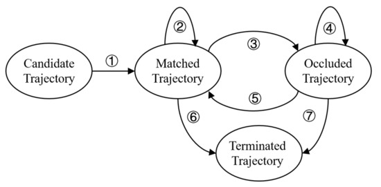 Usually, the purpose of the association is to match detections with predicted trajectories. In traditional trajectory management strategy, a new trajectory will be initialized if a target is detected in successive frames. An existing trajectory survives when there is detection matched with it. Alternatively, an existing trajectory will be terminated if there is not any detection matched with it for a long time. However, when a target is occluded and not detected for a long time, its corresponding trajectory will be terminated, and when the target reappears, a new trajectory will be initialized, which will cause the trajectory of the occluded target to be unstable. In order to solve this problem, we make some improvements via trajectory management considering occlusion. There are four trajectory states for the occluded trajectory: candidate trajectory, matched trajectory, occluded trajectory, and terminated trajectory. As shown in Figure 2, these states can transfer to each other. The corresponding conditions in Figure 2 are as follows: