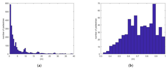 The KITTI datasets are used to verify and analyze the performance of the proposed method. The 2011_09_28_drive_0016 is collected at an intersection on campus with 186 frames. These data are used for Section 3.1 and Section 3.2. The 0016 and 0017 data of the KITTI MOT benchmark training set are collected in the campus with 209 frames and the urban area with 145 frames, respectively. These data are used for Section 3.3. The above three experimental datasets contain dense pedestrians with self- and inter-target occlusion. In addition, we have acquired data in Beihang University using Livox Horizon LiDAR. We can call these Beihang data in this paper. Beihang data include seven nonlinear moving persons. Their wandering in smaller areas produces serious occlusion, which will be applied to verify the tracking performance for dense nonlinear moving pedestrians in Section 3.3. Taking 2011_09_28_drive_0016 as an example, to represent the density of pedestrians, the statistical results of the nearest distance among pedestrians are shown in Figure 3. It can be seen that the maximum proportion of pedestrian distance is less than 1 m. Figure 3b shows the distribution of pedestrians distance within 1 m. Therefore, the experimental scenery belongs to the typical area.