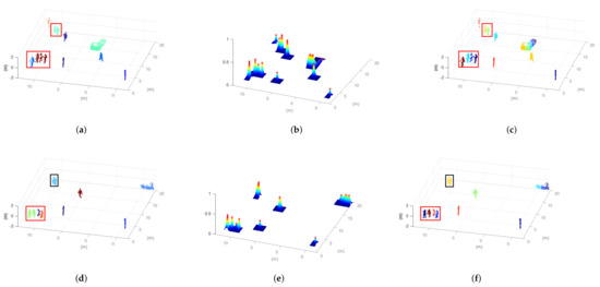 Frame 1 and frame 38 of the experimental dataset are shown in Figure 4. Before clustering, we use RANSAC to remove ground points. The clustering results are shown in Figure 5. Figure 5a,d are the clustering results of RBNN. Figure 5b,e are the kernel density estimation of RBNN clustering results, which are the basis of fine segmentation. Figure 5c,f are the clustering results after fine segmentation.