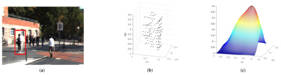 However, neither the RBNN nor the proposed fine segmentation method can segment the two pedestrians in the black box of frame 38 accurately as they are close to each other and occluded seriously. Their optical image is shown in the red box in Figure 6a. Figure 6b,c show their LiDAR point cloud and the kernel density estimation, respectively. It can be seen that the kernel density estimation of the point cloud, just from one single peak caused by the very close distance, exhibits the wrong result of clustering.