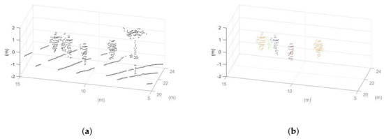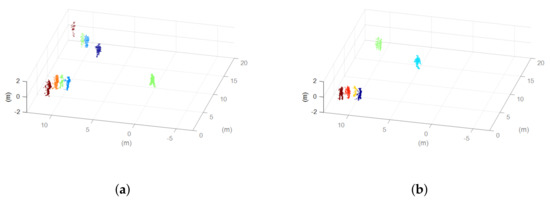 After the preprocessing, such as the clustering and segmentation, we can use the three novel features to detect pedestrians. Figure 7a,b are, respectively, the pedestrian detection results after features-based discrimination of frame 1 and frame 38 under the parameters and . By comparing the fine segmentation clustering results in Figure 5c,f with the detection results in Figure 7a,b, it can be seen that the vehicle and traffic poles in the clustering results have been successfully removed. That means the three novel features defined in this paper can effectively distinguish pedestrians from other objects, such as vehicles, traffic poles, and trees.
