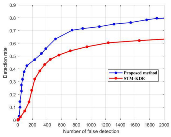 Table 1 shows the detection results of the STM-KDE and the proposed method on the 2011_09_28_drive_0016 dataset. It can be found that the proposed method not only improves the detection accuracy, but also significantly improves the recall rate of pedestrian detection. The F1 score is also improved from 0.5122 to 0.7838. Figure 8 shows the ROC curves of different detection methods. The blue line shows the performance of the proposed method. The red line shows the performance of the STM-KDE. It can be seen that, under the same false-alarm number, the detection rate of the proposed method is higher than STM-KDE. The point cloud from long-distance pedestrian is sparse. STM-KDE uses the unique template based on LARK feature to match targets, which is difficult to use effectively for pedestrians at different distances. Perhaps using multiple templates from different distances could improve the detection performance of STM-KDE. In the proposed method, the three novel features are related to the proportion of pedestrian body, so they are robust to different distances and can obtain better detection performance.